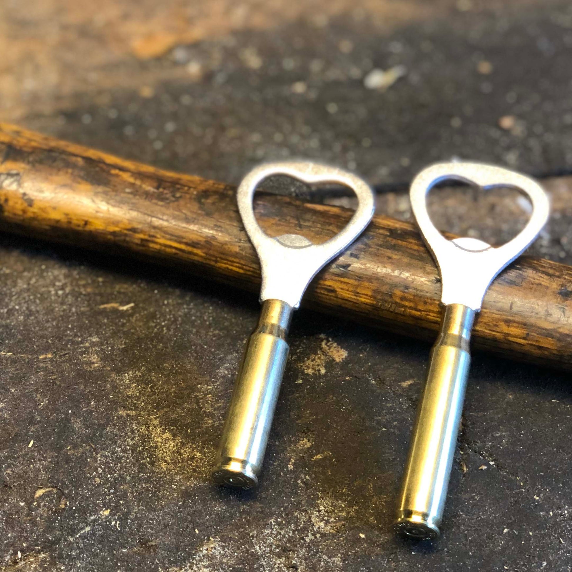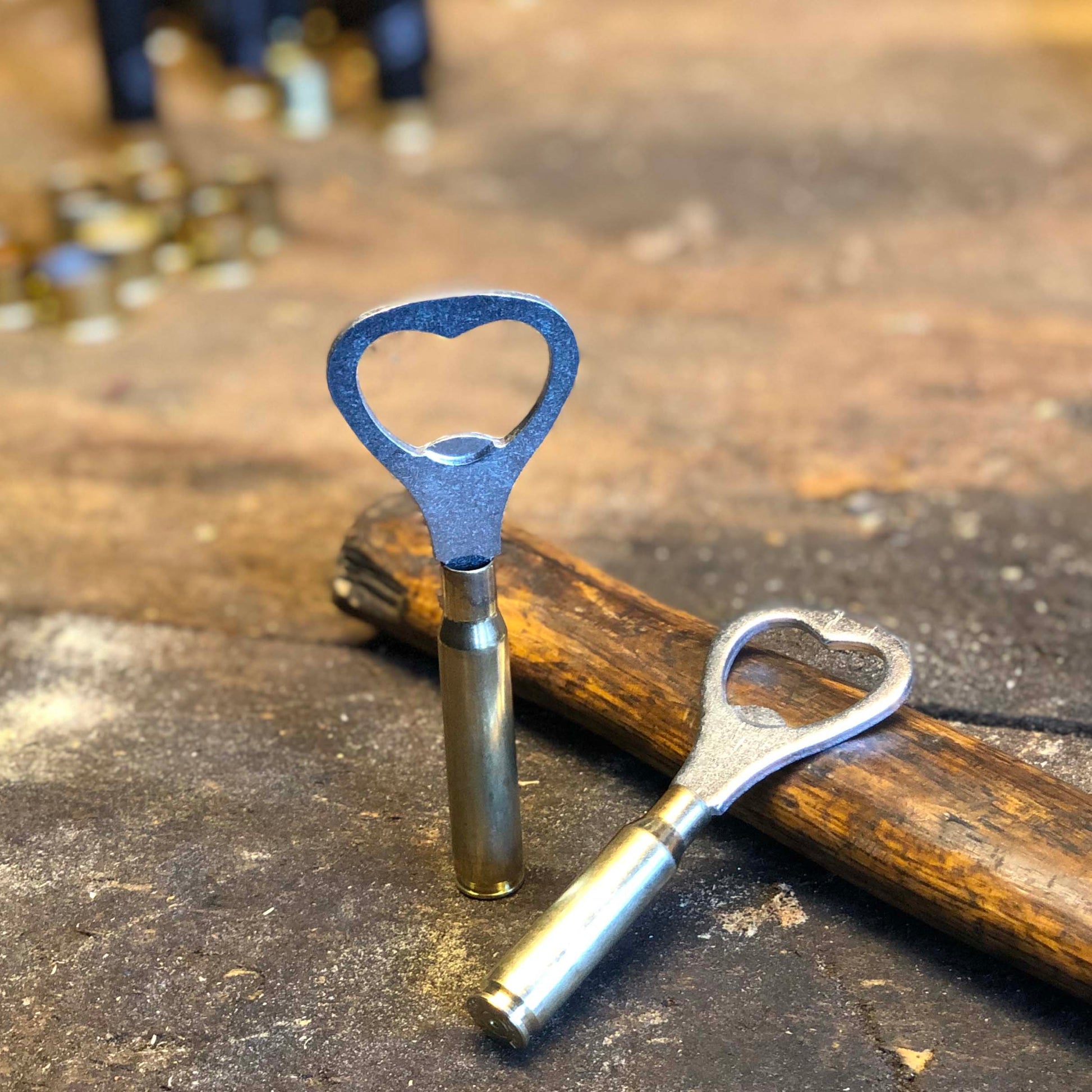 En flasköppnare i metall tillverkad av en äkta återbrukad hylsa och perfekt att ha på bordet för att öppna alla drycker med kapsyl. Finns i 2 st olika storlekar