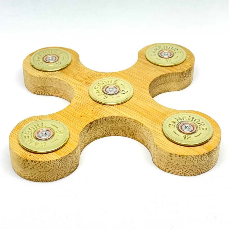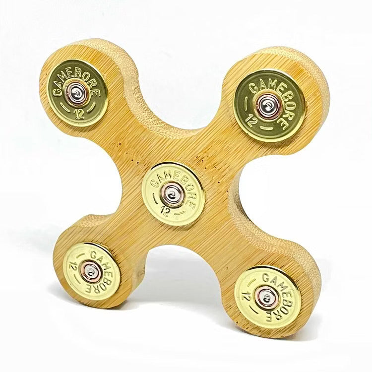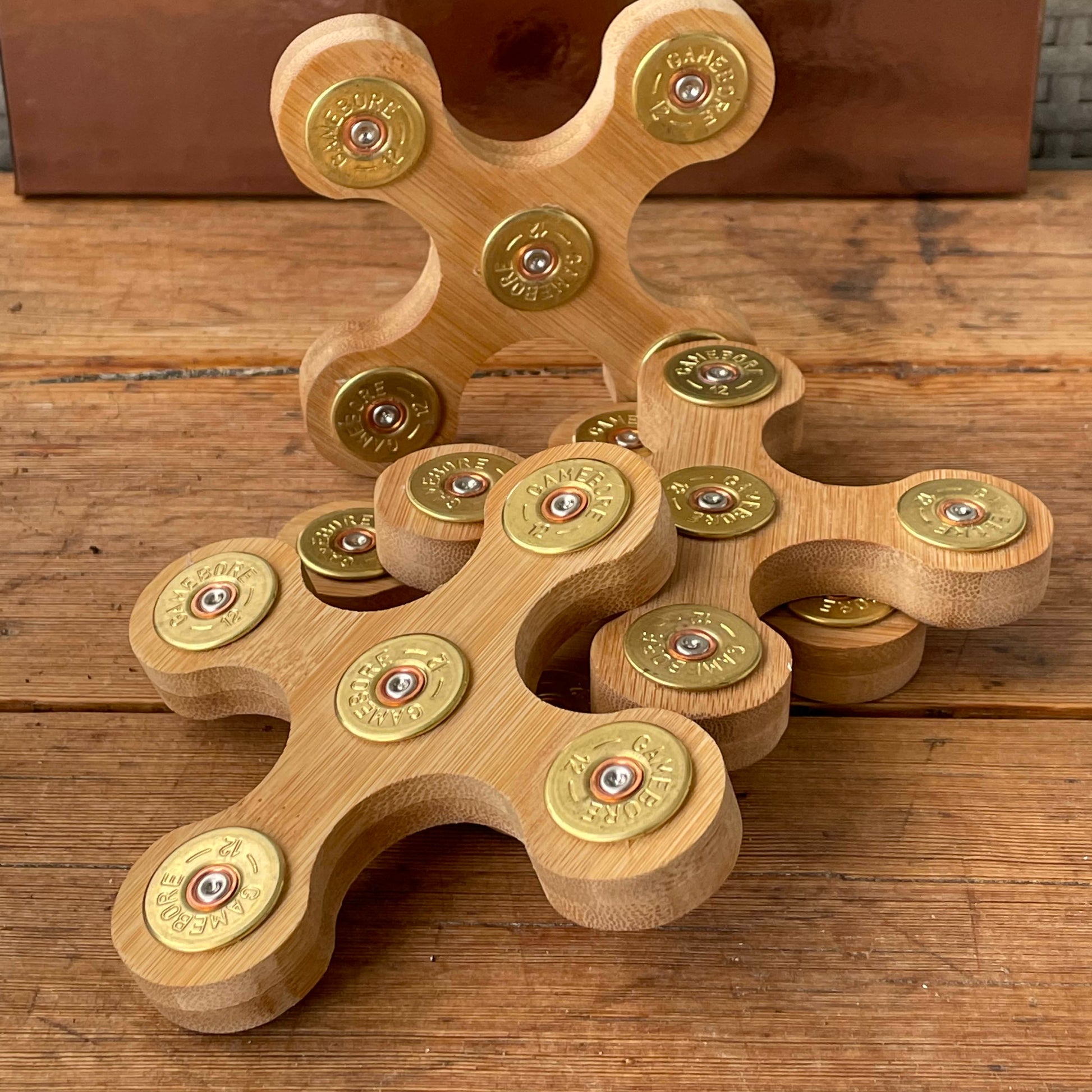 Tillverkat i trä med skyddande mässingsdetaljer av återbrukade hylsor.