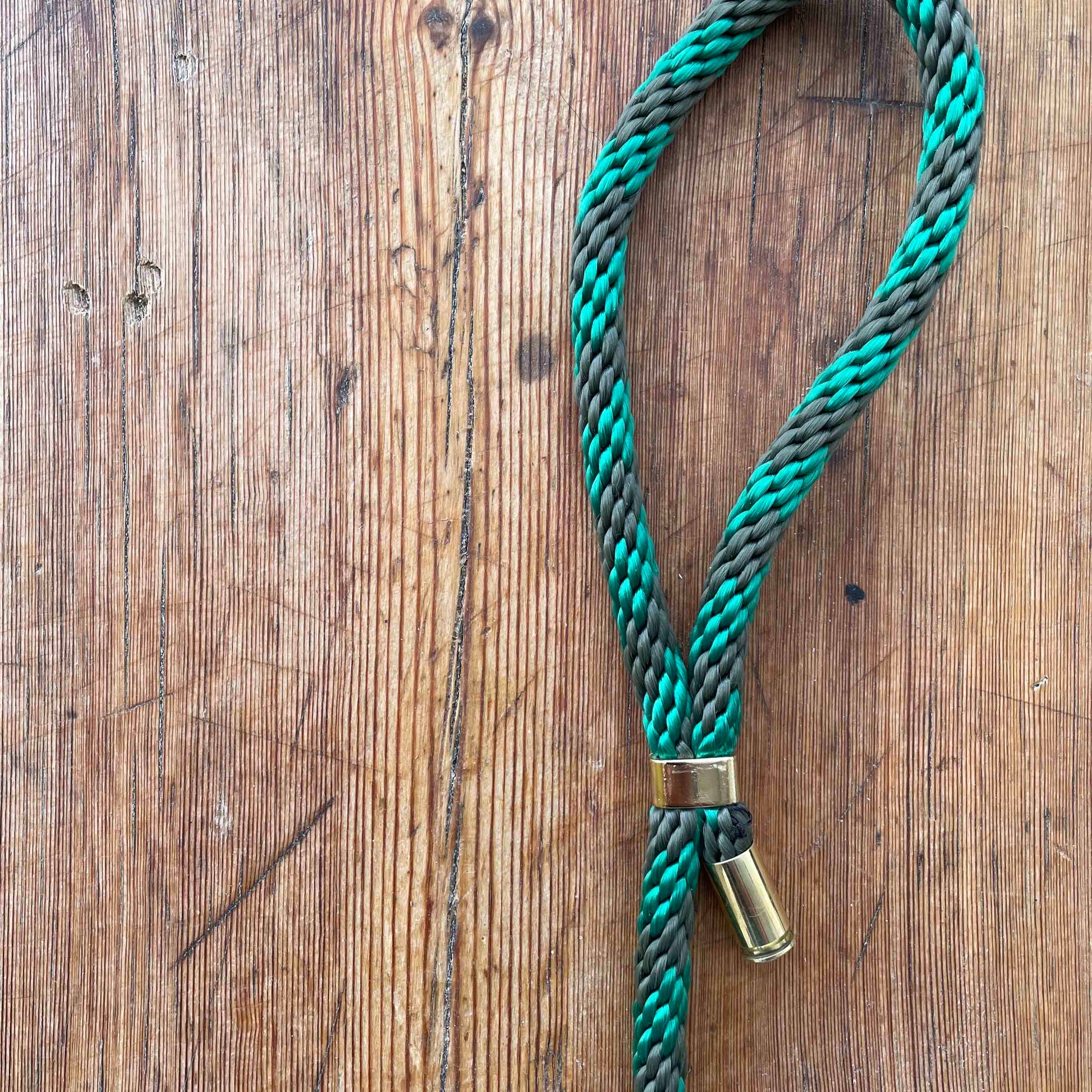 Jaktpresenter´s gröna hundkoppel som vi tillverkar av 8 mm mjukt polypropylen band flätat av 18 trådar.
