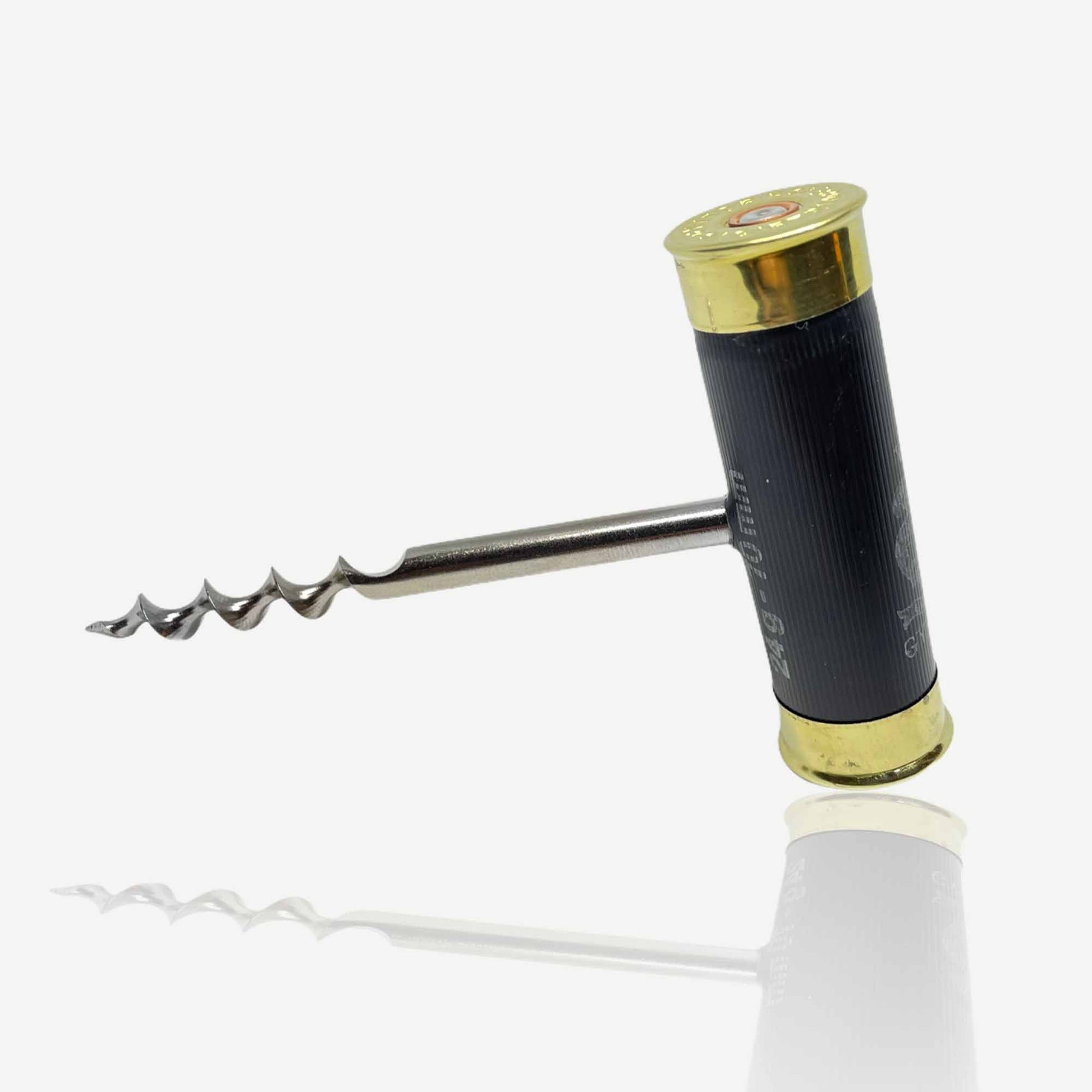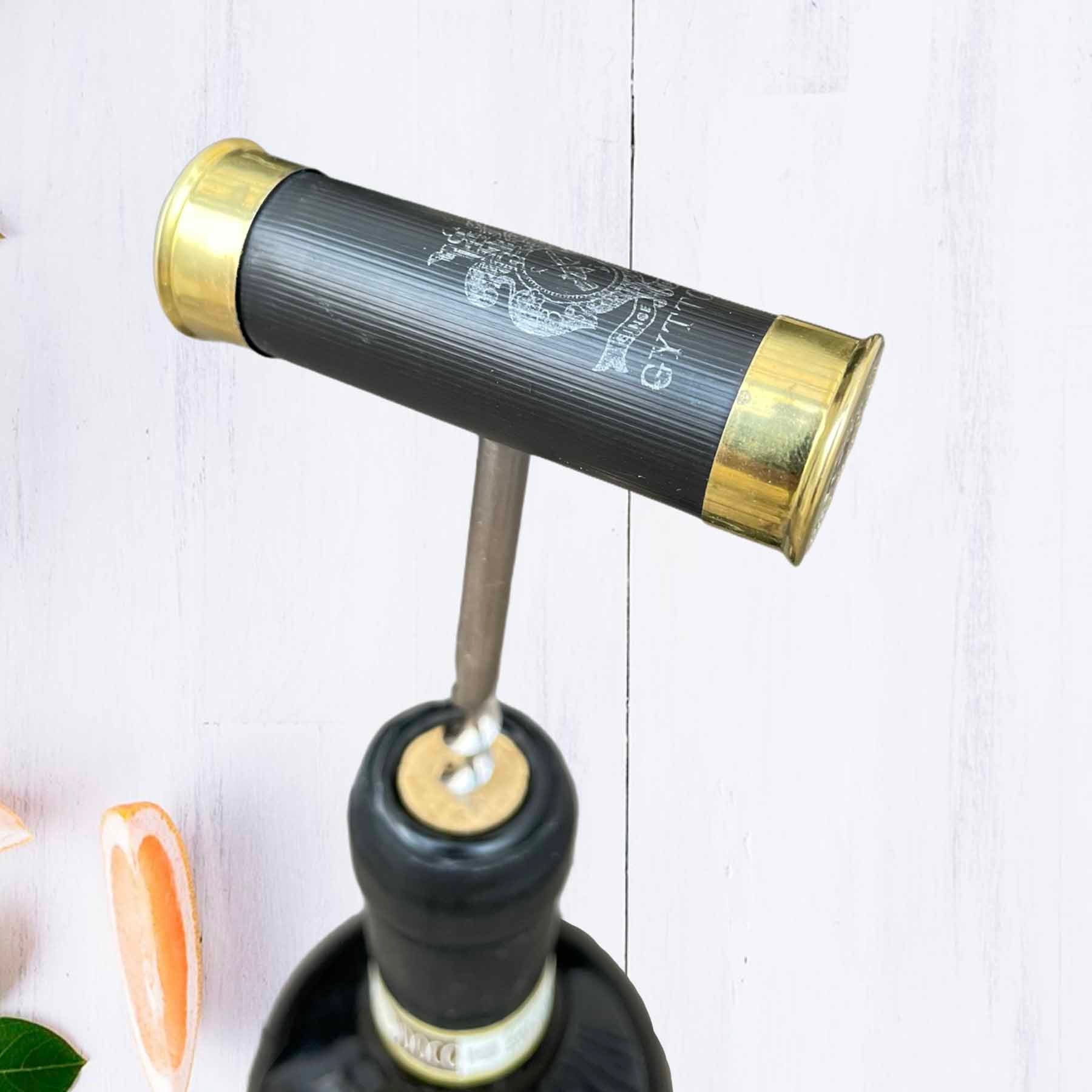 En unik vinöppnare / korkskruv tillverkad av återbrukade hagelhylsor. En självklar detalj när det ska öppnas ett gott vin till viltmaten. En perfekt present och garanterat uppskattat av jägare.