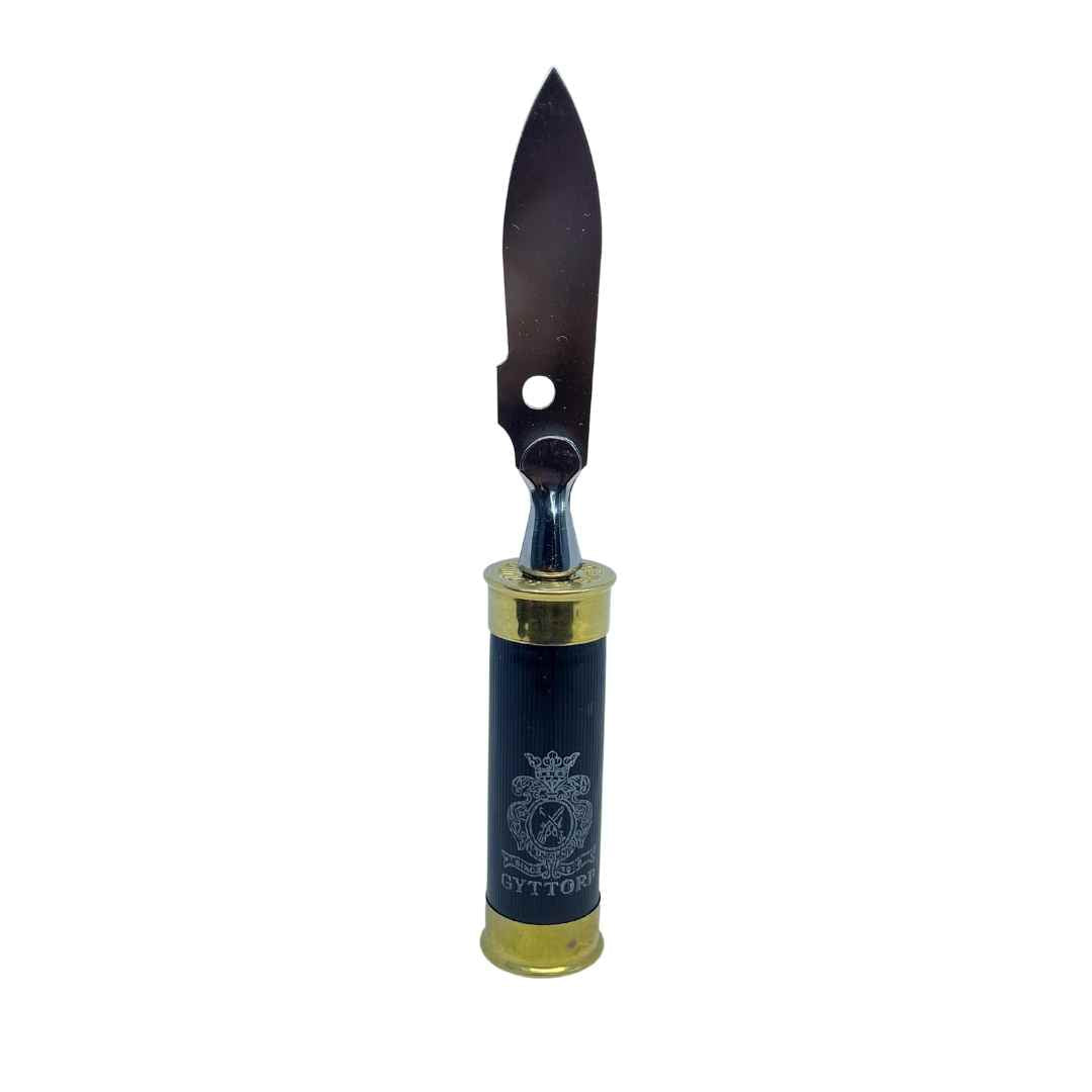En unik kräftkniv i återbruksdesign i vår Röstorp Serie med blad i rostfritt stål och ett handtag tillverkat av återbrukade hagelhylsor.