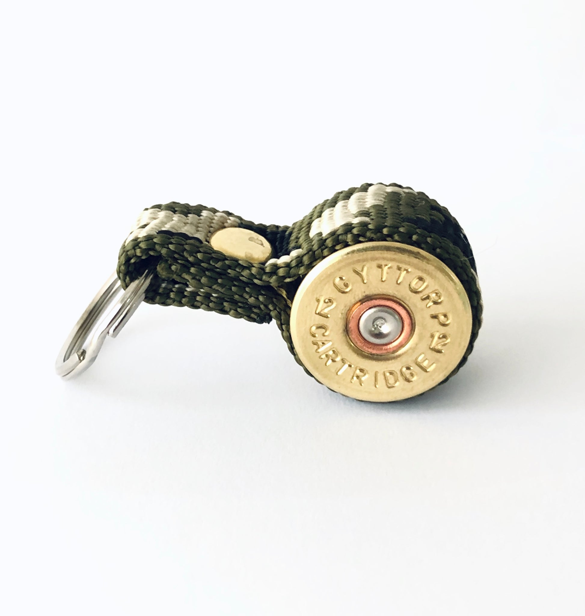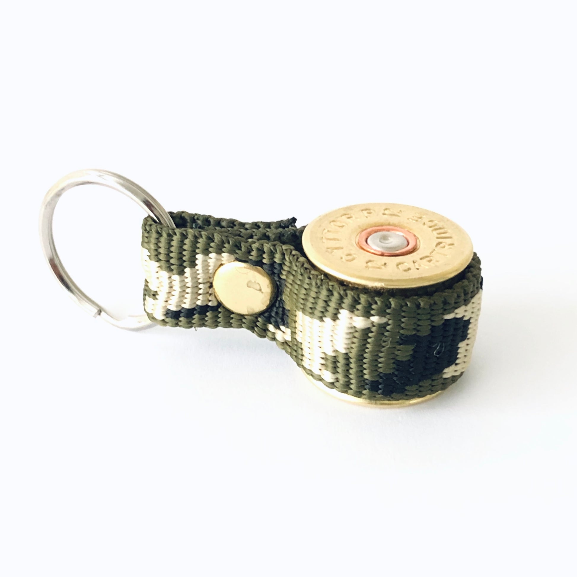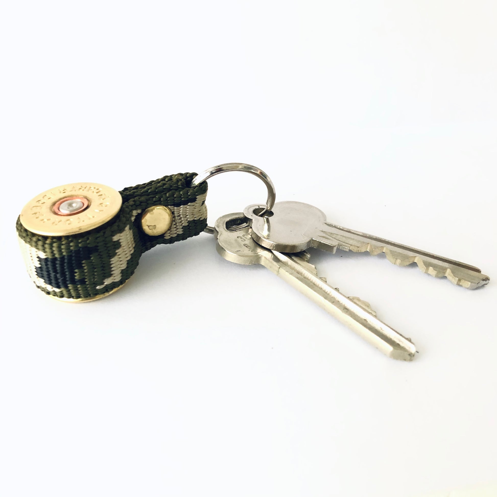Snygg nyckelring tillverkad av 2 st återbrukade hagelhylsor i kaliber 12 med grönt kamouflageband och nit av mässing.