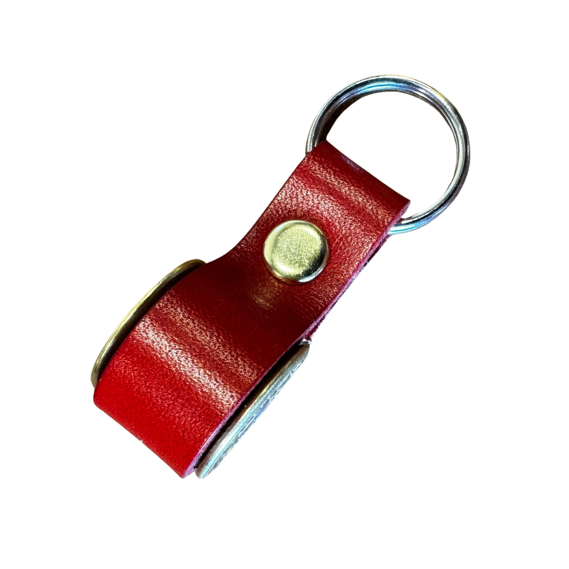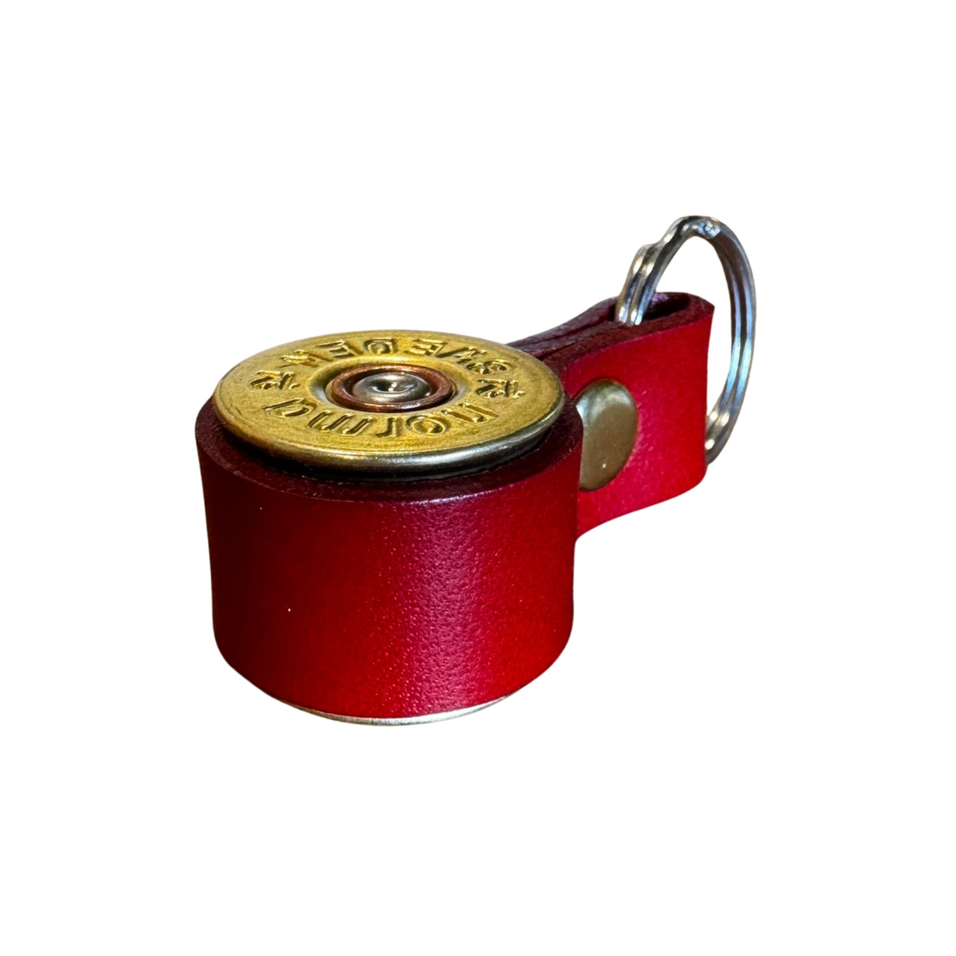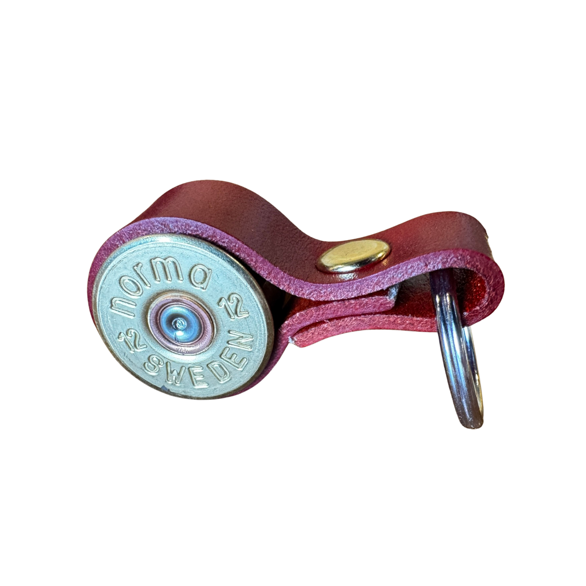 Snygg nyckelring tillverkad av 2 st återbrukade hagelhylsor i kaliber 12 med äkta rödbrunt läder och nit av mässing.