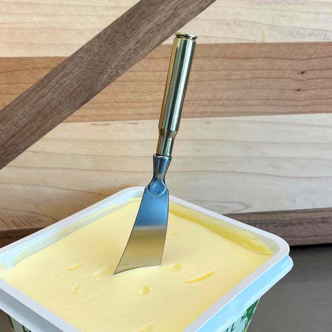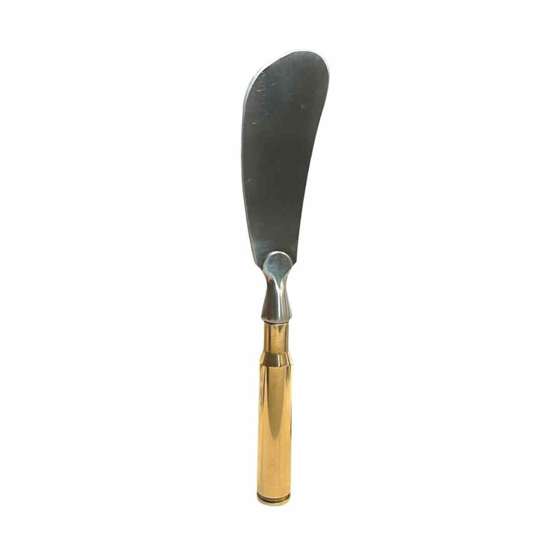 En snygg och elegant smörkniv i vår Bergslagen Serie. Återbruksdesign med blad i rostfritt stål och ett handtag tillverkat av återbrukade mässingshylsor, en smörkniv som passar lika bra till vardags som till festbordet.