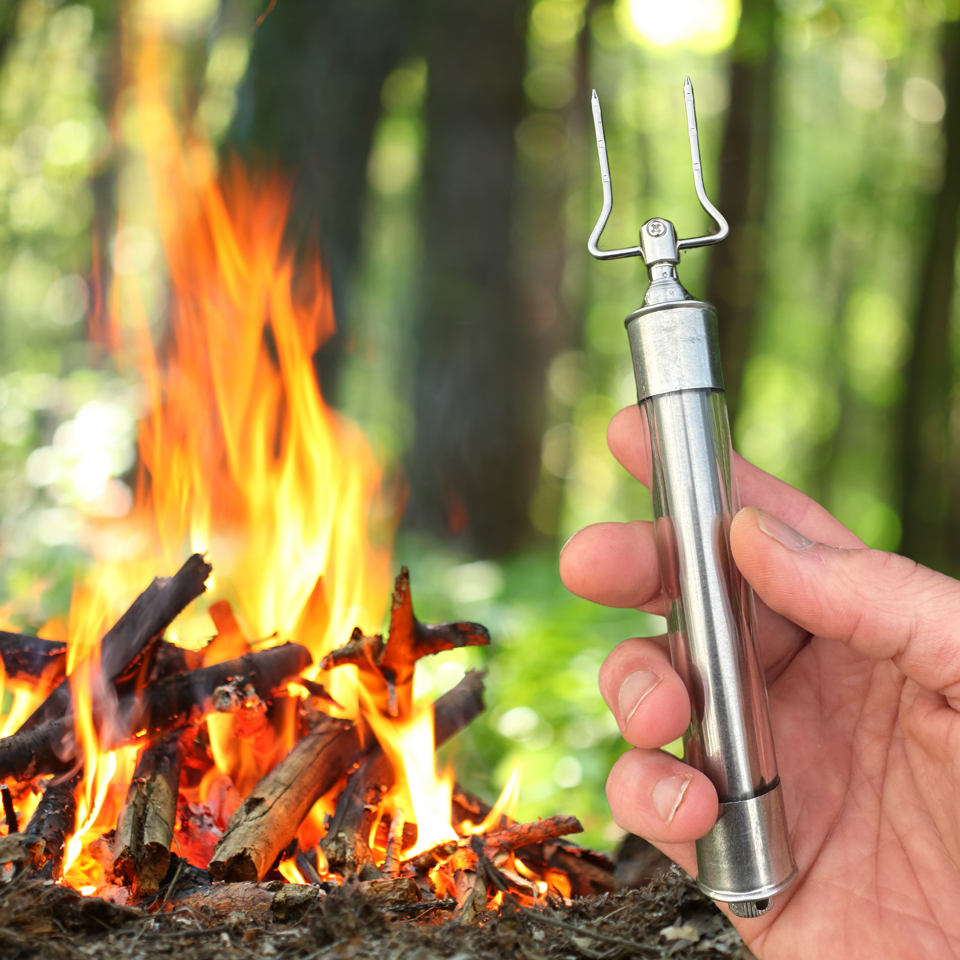 En grillpinne utöver det vanliga! Denna stilfulla teleskopiska grillpinne kombinerar funktionalitet med en påfallande återbruksdesign som garanterat väcker uppmärksamhet vid grillen. Perfekt present till jägaren som älskar korvgrillningen kring brasan eller grillmästaren som "har allt".